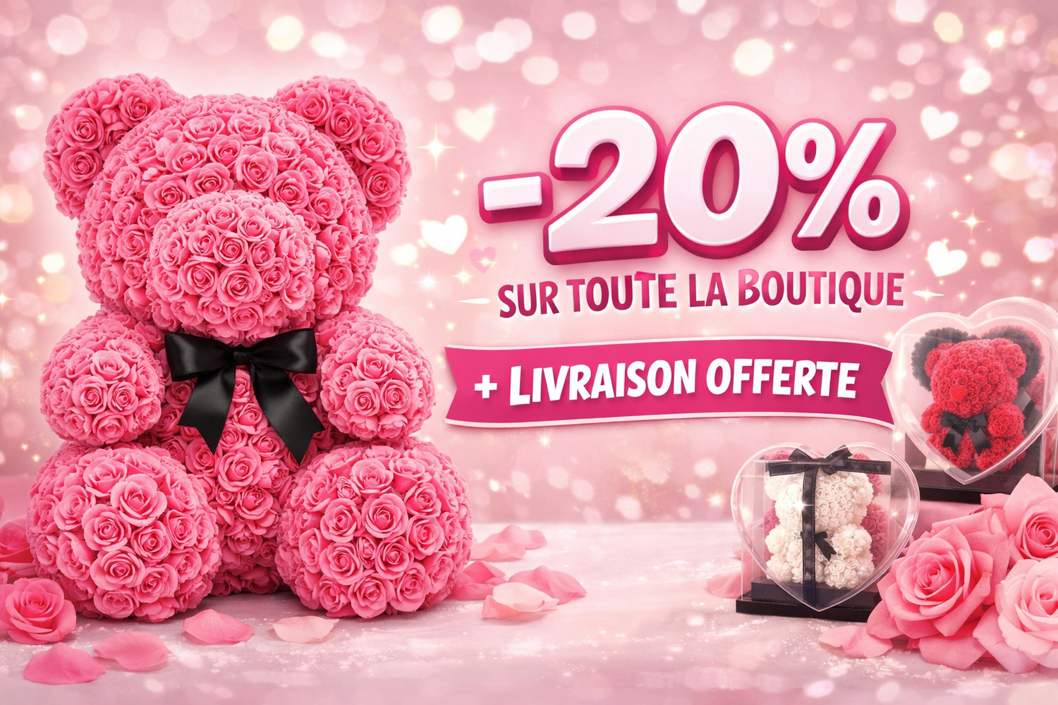 Ours en Roses Artificielles Rose 25 cm – Cadeau Romantique